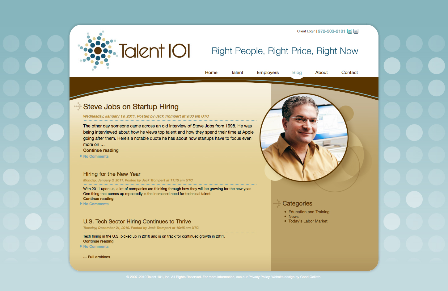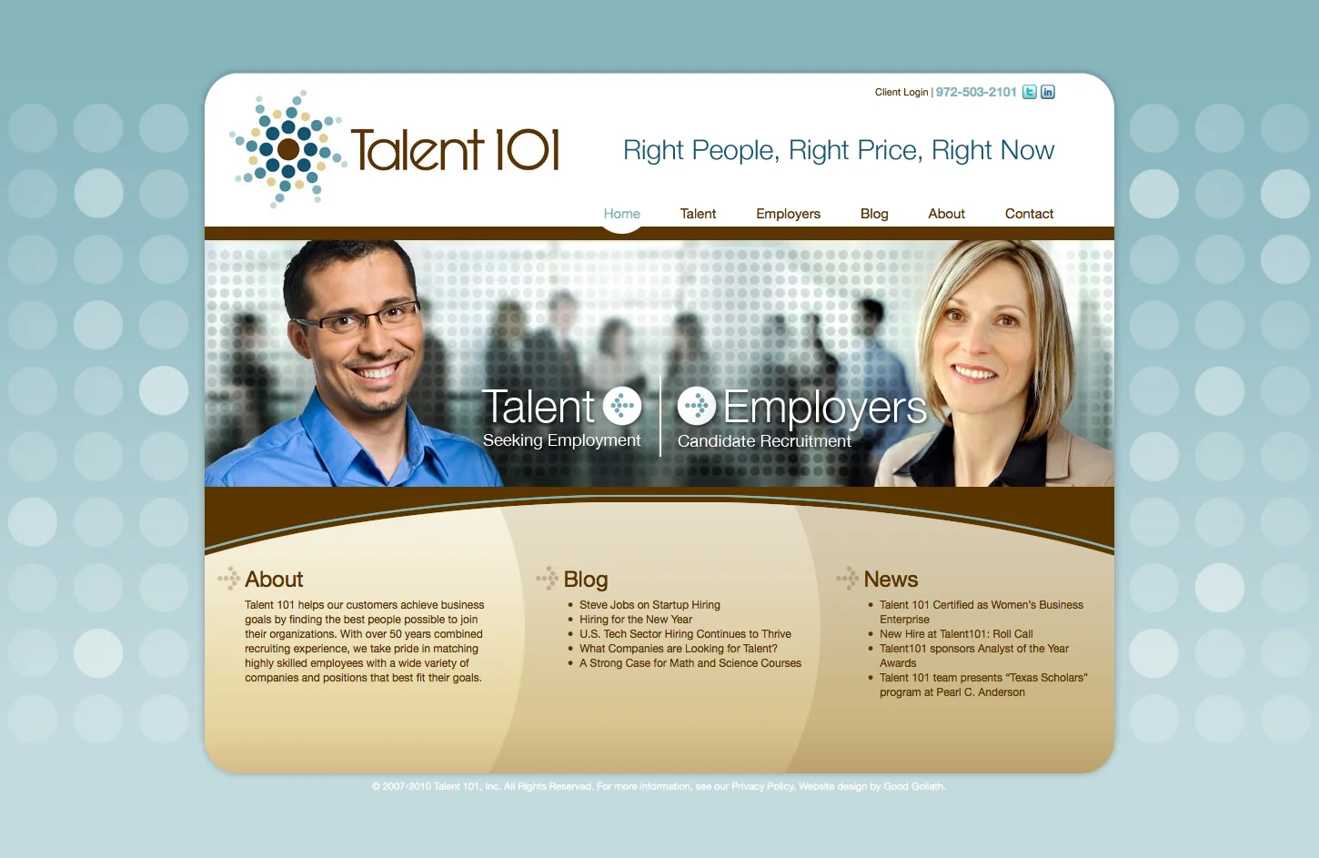 While I was working with Jaxzen Marketing Strategies, one of their new clients, Talent 101, requested a brand update that included a new website design to compete with other professional tech workforce recruiting firms. The client requested a site that incorporated a circular theme with a modern appeal and focused on people in the workforce to emphasize the employer/employee relationship. I presented some design variations and color options. They selected a teal/brown color palette for their logo, so I used shades of those colors as accents to their website. Using the circular theme from their logo, I created a tiled texture for the background. For more cohesive continuity, I incorporated the circular theme within other graphics of the site. The home page banner image contained clickable hot spots, so if the user clicked on the left or right side of the banner, it would fast track the visitor to the appropriate content page of the site.
