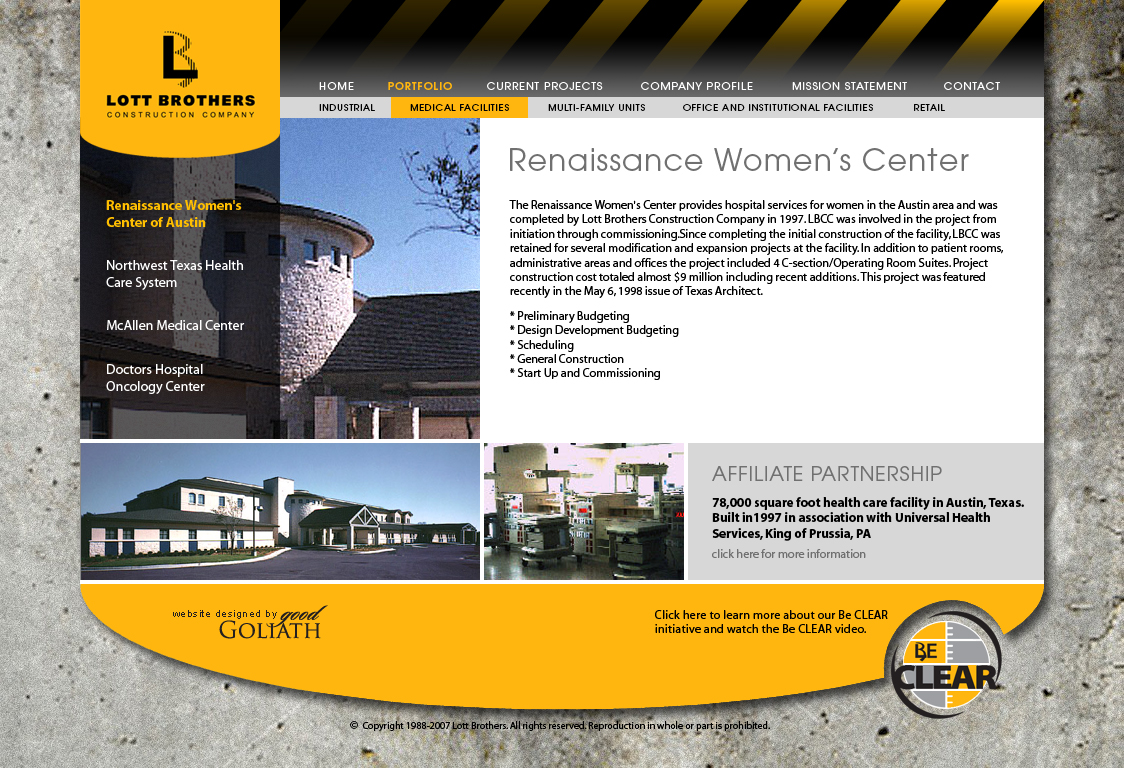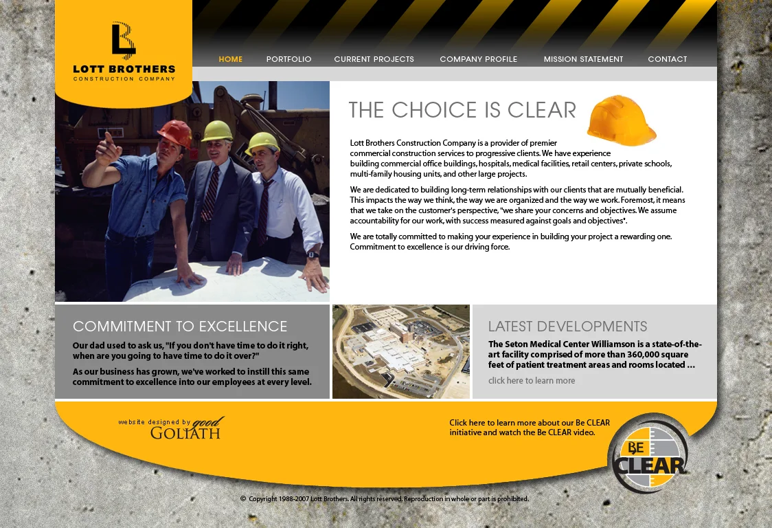 While I was a senior visual designer with the Good Goliath marketing agency, I designed the visual components of the Lott Brothers website. The website framework was developed in WordPress. The client directives were to design framework that could showcase a lot of photography, and incorporate their logo badging and their Be CLEAR logo prominently through the site. They wanted their site to look professional but with a very rugged appeal that the user would know immediately when they were on the landing page that they were a construction company.